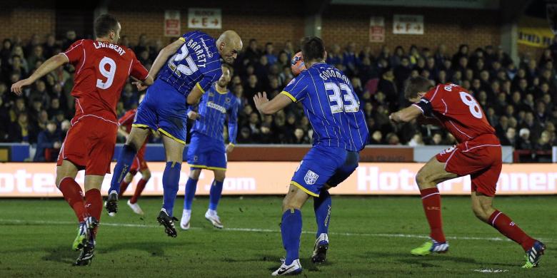 Kapten Liverpool Steven Gerrard (kanan) mencetak gol pertama (dari dua) dengan sundulan pada menit ke-12 pertandingan putaran ketiga Piala FA melawan AFC Wimbledon, di Cherry Red Records Stadium, Kingston upon Thames, Senin (5/1/2014). Laga itu berakhir 2-1.